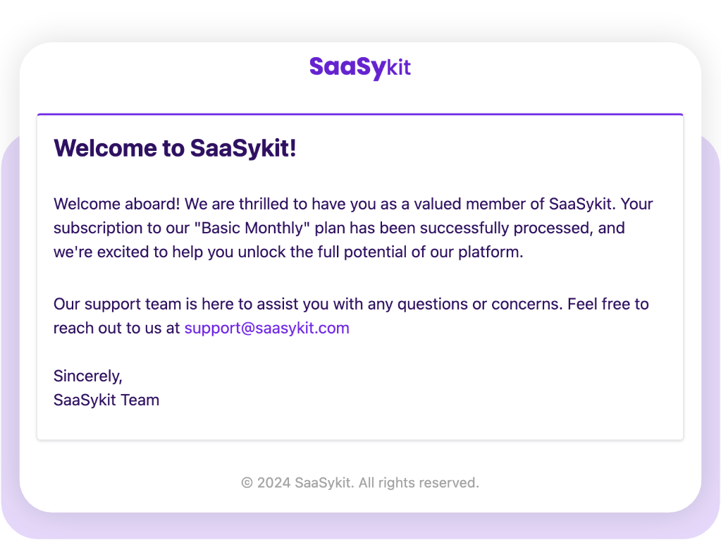 ConstructKit comes with a beautiful email template out of the box that takes your brand colors into consideration, along with the typical emails for customer registration, verification, resetting password, etc set up for you.